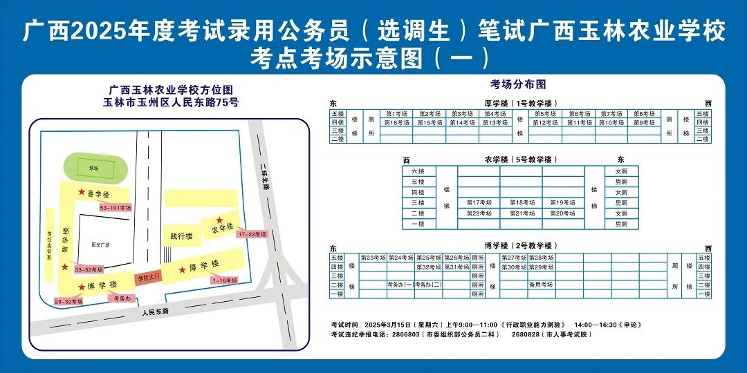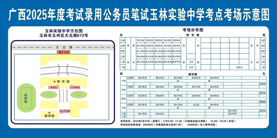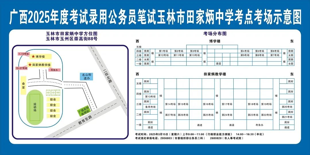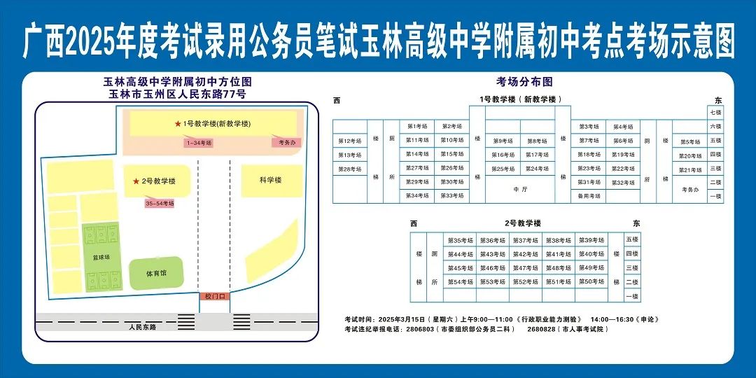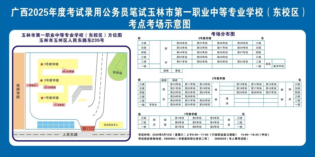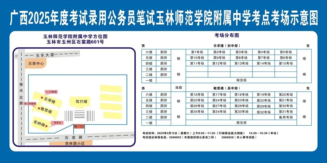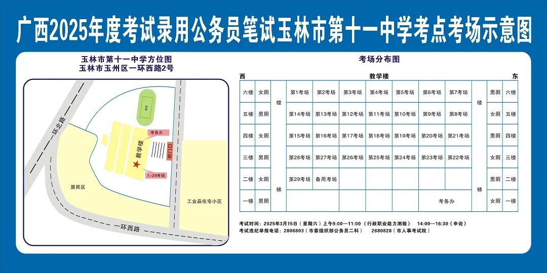 除考試當(dāng)天考生可以進(jìn)入考點(diǎn)外,考生不得提前進(jìn)入考點(diǎn)查看考場(學(xué)校將在大門處擺放考場分布示意圖),玉林考區(qū)11個考點(diǎn)的考場布置情況如下: