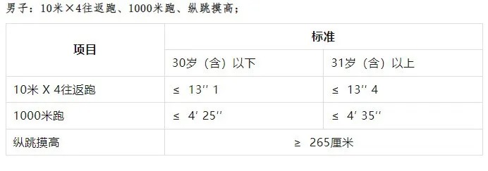 2.體能測評項目和標準按照《公安機關(guān)錄用人民警察體能測評項目和標準(暫行)》執(zhí)行。體能測評標準報考人員須參加全部三項體能測評,全部達標方為合格,如放棄一項則視為不合格,體能測評合格的方可進入下一環(huán)節(jié)。