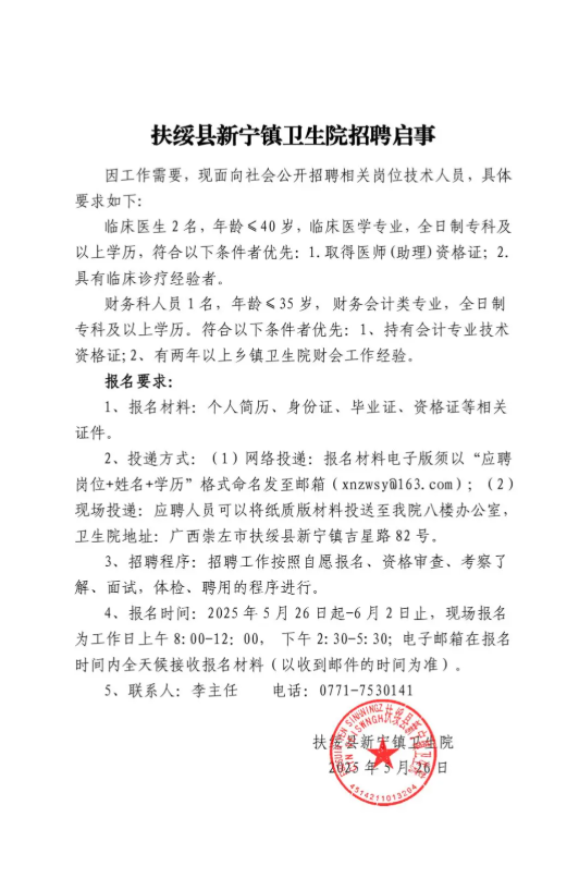 2025年廣西崇左扶綏縣新寧鎮(zhèn)衛(wèi)生院招聘3人