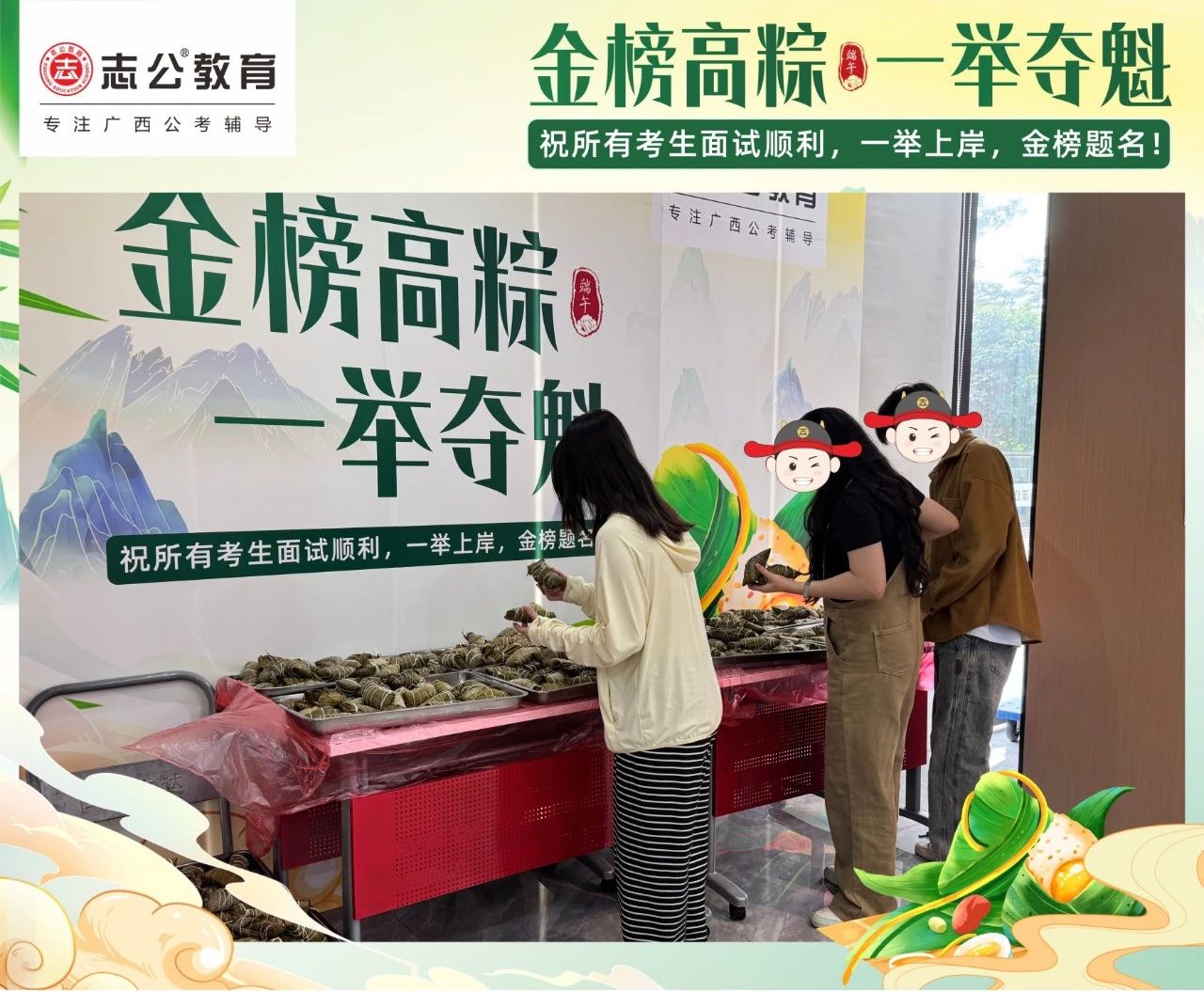 最后,再次祝愿大家端午節(jié)安康,六一兒童節(jié)快樂!愿志公教育每位員工在雙節(jié)的喜慶氛圍中,收獲滿滿,幸福常伴!也愿志公教育每位學(xué)員吃上粽子一舉高“粽”,實(shí)現(xiàn)自己的公職夢(mèng)想!
