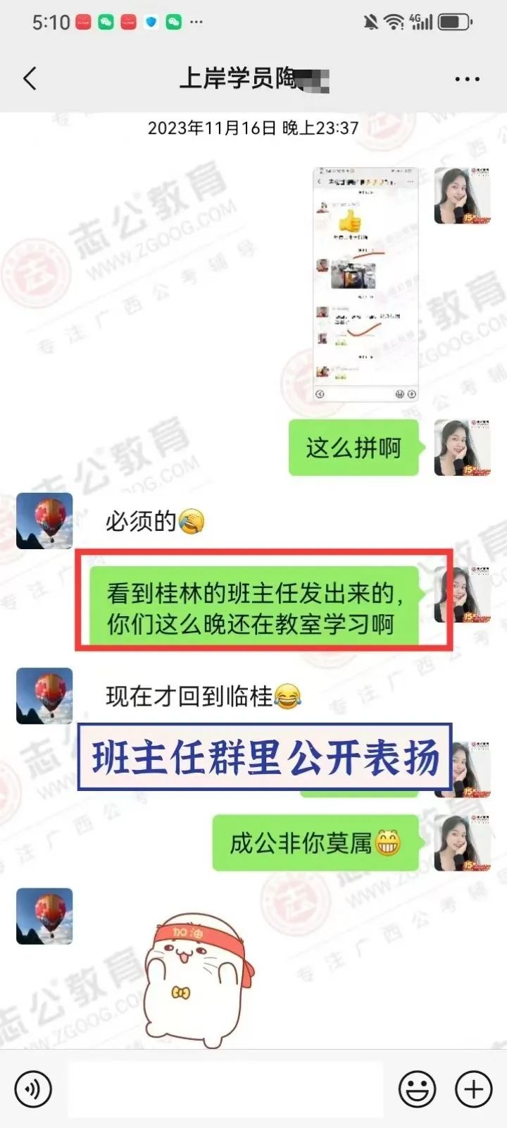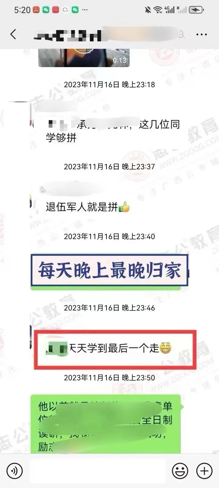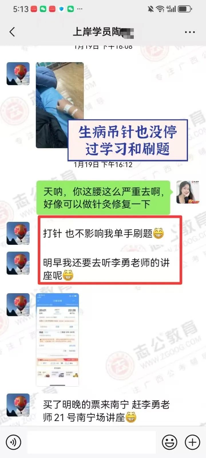 在備考的日子里,無(wú)數(shù)個(gè)夜晚,我看到他朋友圈發(fā)的經(jīng)常學(xué)習(xí)練習(xí)到教室關(guān)門(mén)最后一個(gè)才回家,無(wú)數(shù)次往返南寧和桂林兩座城市,只為家庭和研究生學(xué)業(yè)和公務(wù)員備考的有序進(jìn)行,讓我印象最深的一次,就是他微信拍了一張正在打針輸液的照片發(fā)給我,還打趣的跟我說(shuō):還好不影響我單手刷題! 即使學(xué)員因?yàn)樯眢w過(guò)于勞累導(dǎo)致生病在吊針,也絲毫沒(méi)有懈怠過(guò)學(xué)習(xí),讓我非常的佩服和感動(dòng)。
