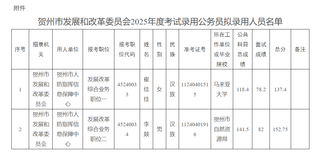 附件:賀州市發(fā)展和改革委員會2025年度考試錄用公務(wù)員擬錄用人員名單