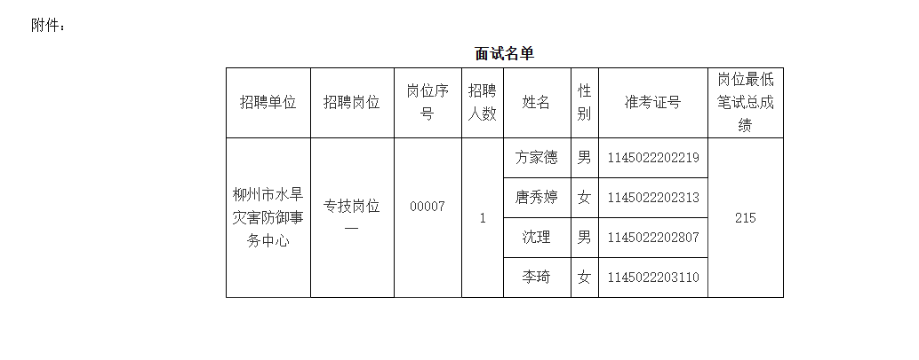 根據(jù)《柳州市2025年度上半年事業(yè)單位公開考試招聘工作人員公告》《廣西壯族自治區(qū)事業(yè)單位公開招聘人員實(shí)施辦法》(桂人社發(fā)〔2011〕155號)、《關(guān)于印發(fā)<廣西壯族自治區(qū)事業(yè)單位公開招聘工作人員面試工作規(guī)則(試行)>的通知》(桂人社發(fā)〔2012〕79號)的規(guī)定,柳州市水利局?jǐn)M組織所屬事業(yè)單位公開招聘工作人員面試,現(xiàn)將相關(guān)事宜公告如下: