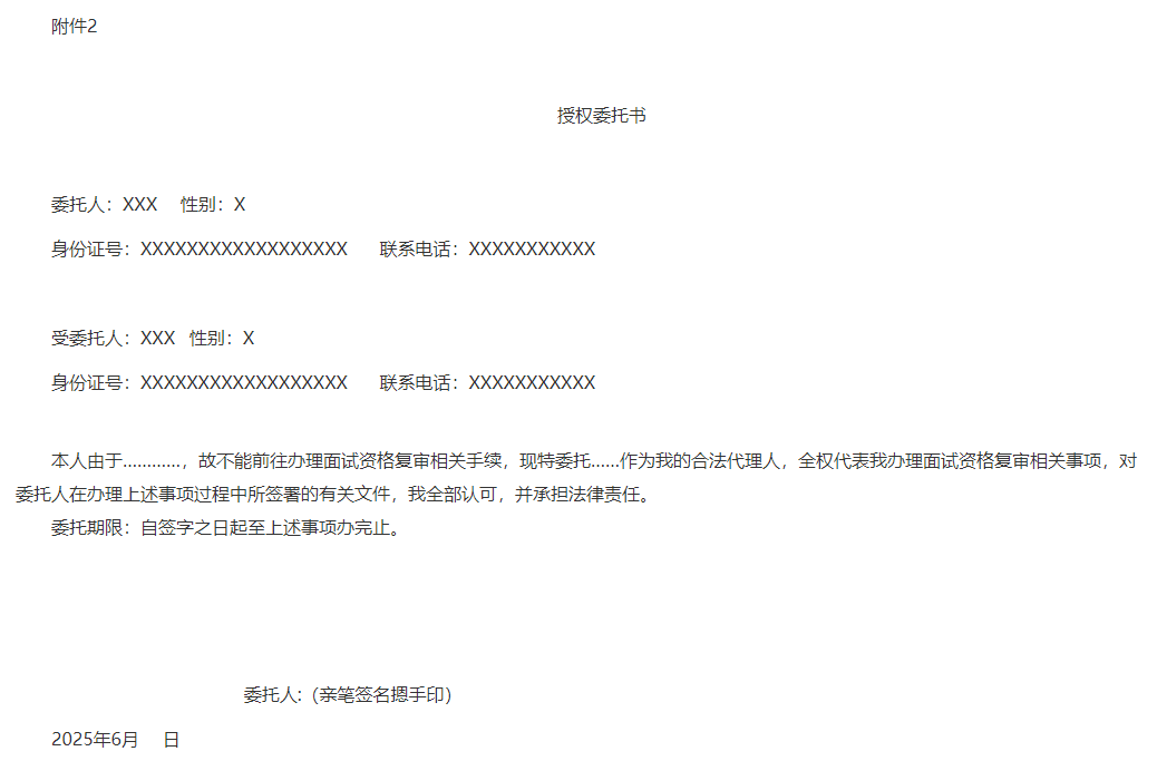 (二)面試資格復(fù)審一般應(yīng)由報考人員本人參加。因特殊原因需由他人代為參加面試資格復(fù)審的,須由報考人員出具委托書(委托書應(yīng)有委托人、受托人的姓名和身份證號碼,委托原因和代辦事項,委托人親筆簽名等,詳見附件2),經(jīng)面試復(fù)審單位同意后,可以委托代理。