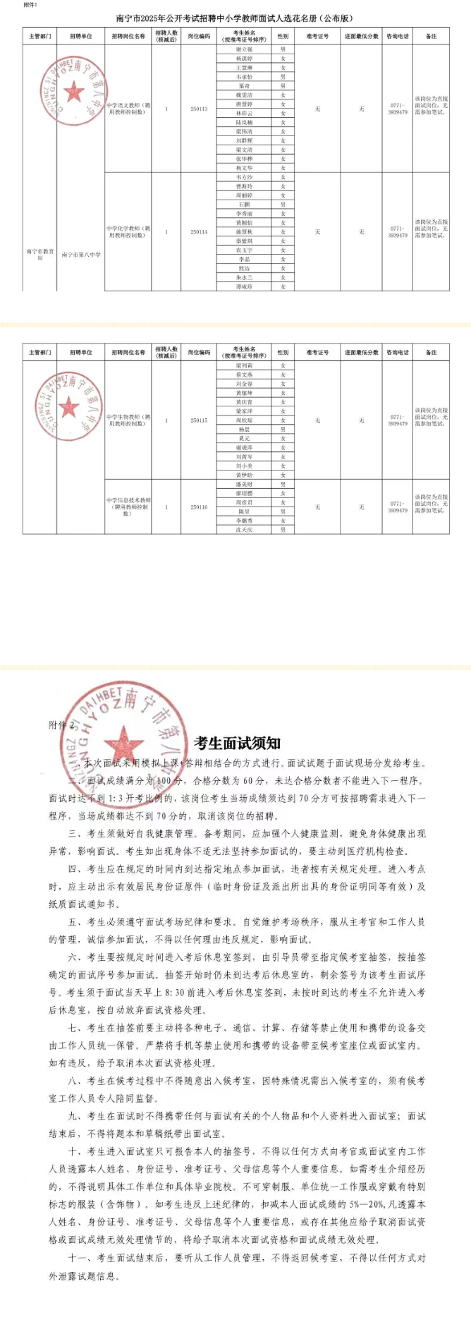 附件:1.南寧市2025年公開考試招聘中小學(xué)教師南寧南分市第八中學(xué)面試人選花名冊