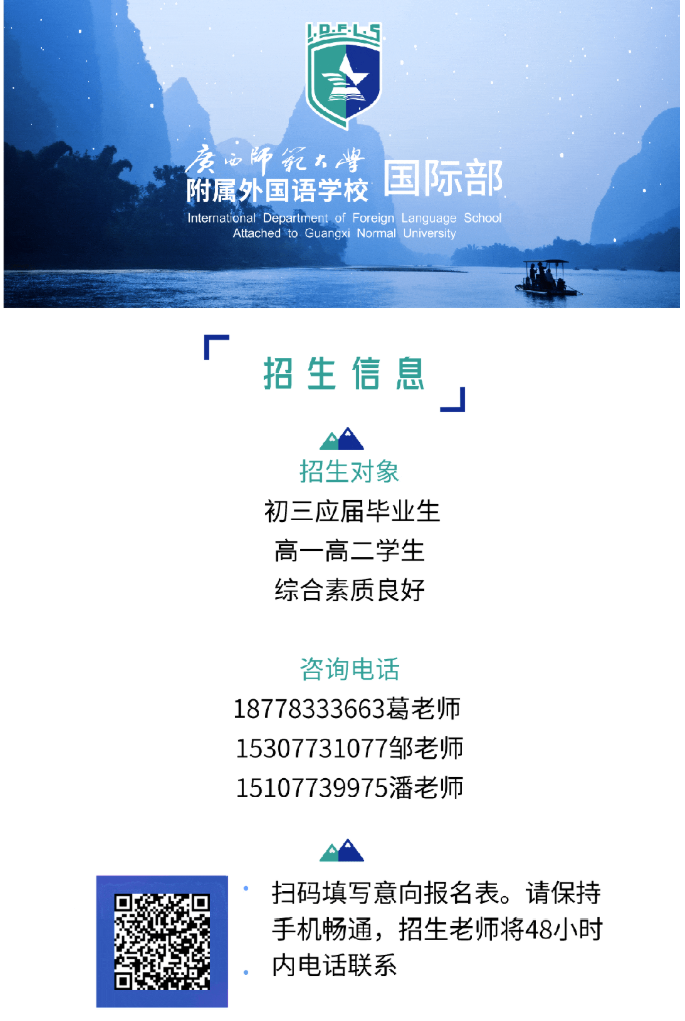 廣西師范大學(xué)附屬外國語學(xué)校位于以山水之美聞名世界的桂林市,教育教學(xué)成績斐然。其國際部是廣西壯族自治區(qū)最早批準(zhǔn)成立的國際部,自2011年成立以來,積極引進(jìn)國外先進(jìn)教育理念,整合師大附外的優(yōu)質(zhì)基礎(chǔ)教育資源,堅(jiān)持社會主義核心價(jià)值觀為導(dǎo)向,培養(yǎng)具有崇高理想、愛國信念和突出跨文化交際能力的社會主義新型人才。