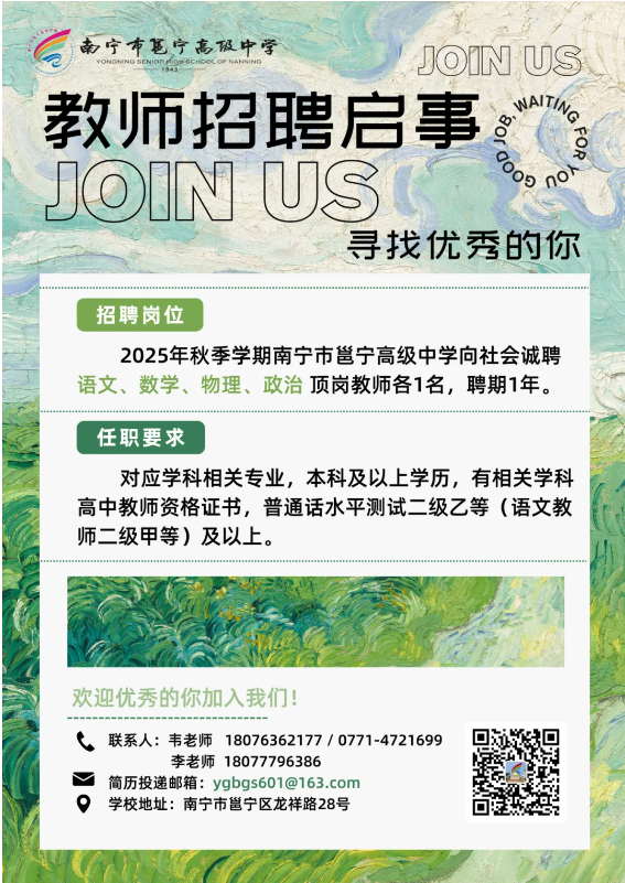 原文標題:南寧市邕寧高級中學2025年秋季學期教師招聘啟事