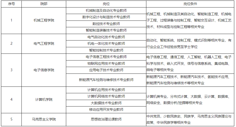 4.專(zhuān)任教師崗具有碩士及以上學(xué)位;具有高校教學(xué)經(jīng)驗(yàn)、中級(jí)以上專(zhuān)業(yè)技術(shù)職務(wù)或行業(yè)企業(yè)工作經(jīng)驗(yàn),條件可放寬至學(xué)士學(xué)位;