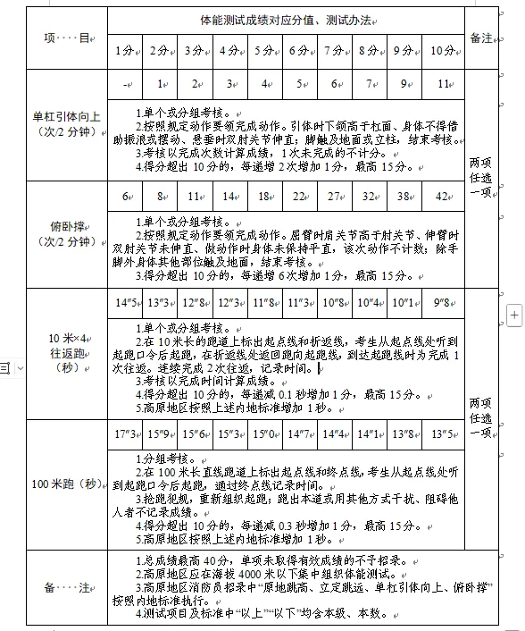 2.體能測試:(1)必考項(xiàng)目:1000米跑;(2)選考項(xiàng)目:①立定跳遠(yuǎn)、原地跳高二選一;②單杠引體向上、俯臥撐二選一;③10米×4往返跑、100米跑二選一;(3)注意事項(xiàng):體能測試有兩項(xiàng)及兩項(xiàng)以上不得分的視為不合格(標(biāo)準(zhǔn)參照附件)。未按時(shí)參加或因身體原因無法測試者,視為自動放棄。