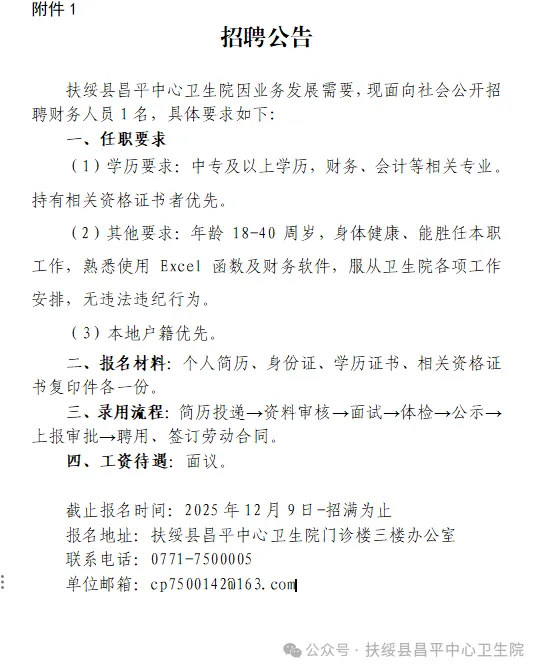 原文標(biāo)題:2025年崇左扶綏縣昌平中心衛(wèi)生院公開招聘財務(wù)工作人員1人