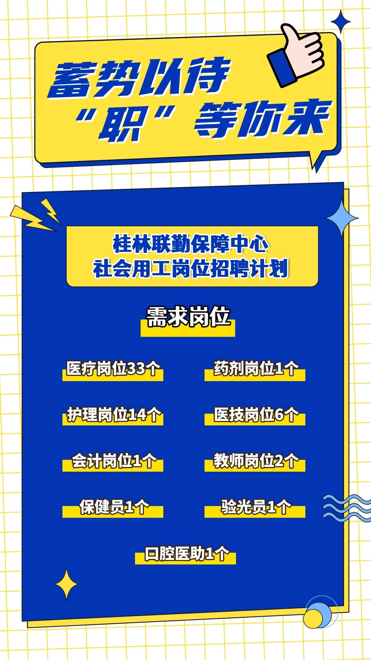 此次發(fā)布桂林聯(lián)勤保障中心社會(huì)用工崗位招聘計(jì)劃60個(gè),其中:專業(yè)技術(shù)崗位58個(gè)(醫(yī)療33個(gè)、藥劑1個(gè)、護(hù)理14個(gè)、醫(yī)技6個(gè)、會(huì)計(jì)1個(gè)、教師2個(gè)、保健員1個(gè))、工勤技能崗位2個(gè)(驗(yàn)光員1個(gè)、口腔醫(yī)助1個(gè))。