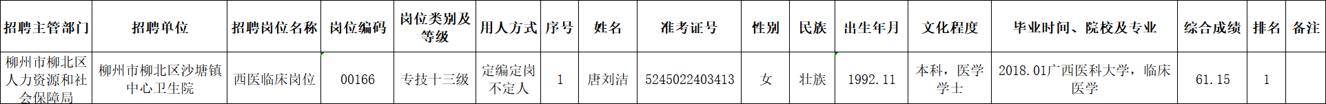 根據(jù)《柳州市2025年度下半年事業(yè)單位公開考試招聘工作人員公告》要求及安排,唐劉潔同志經(jīng)面試、考察、體檢合格,符合聘用條件。經(jīng)研究決定,擬聘用唐劉潔同志為我區(qū)事業(yè)單位工作人員,現(xiàn)予以公示,公示期為5個(gè)工作日(2026年1月22日至2026年1月28日)。對(duì)擬聘用的同志如有異議,請(qǐng)以書面形式,并署真實(shí)姓名和聯(lián)系地址,于2026年1月28日前郵寄或直接送我單位(地址:柳州市柳北區(qū)鷓鴣江六隊(duì)南200米(北外環(huán)路南)柳北區(qū)衛(wèi)生健康局512室;郵編:545002,電話0772-2802642),群眾如實(shí)反映有關(guān)問題受法律保護(hù)。