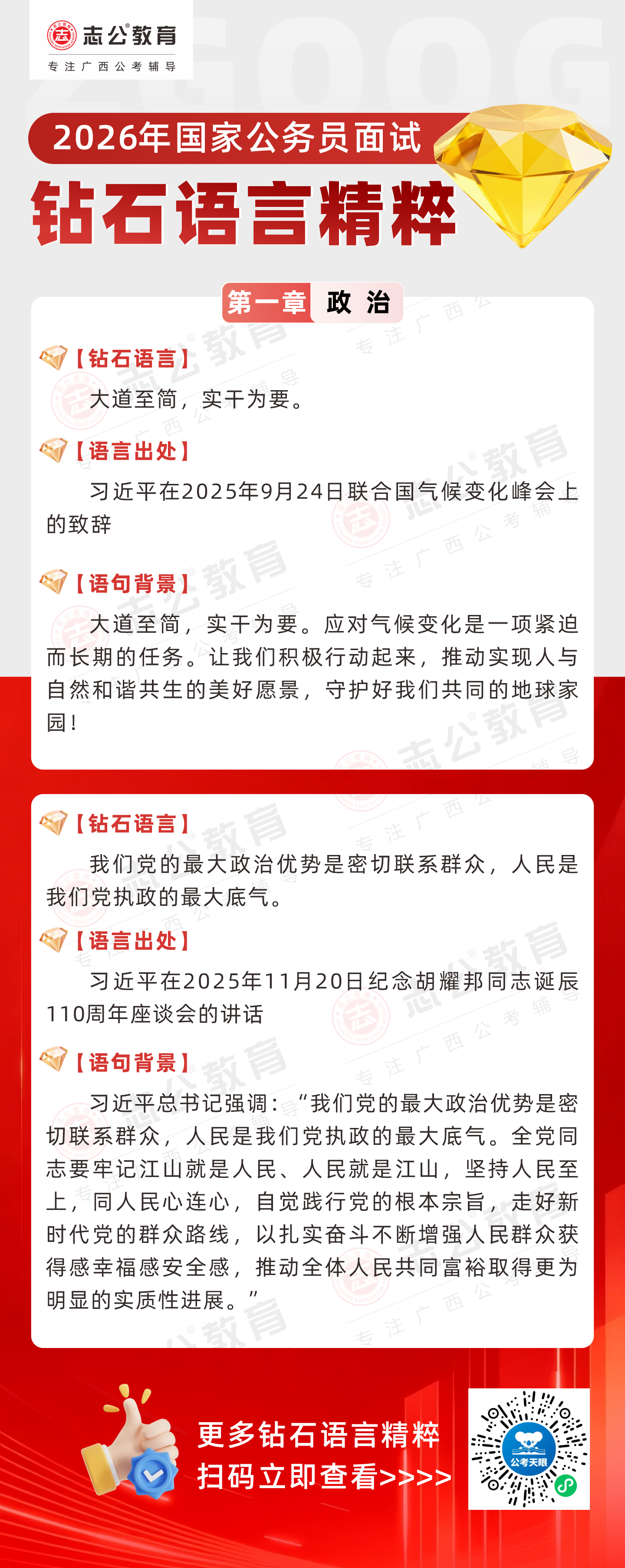 志公教育推出《2026國(guó)家公務(wù)員面試·鉆石語言精粹》政治篇!幫助考生把握政治類題目應(yīng)答邏輯,提升語言表達(dá)層次,助你在面試中脫穎而出。備考2026國(guó)考面試,從掌握“鉆石語言”開始!