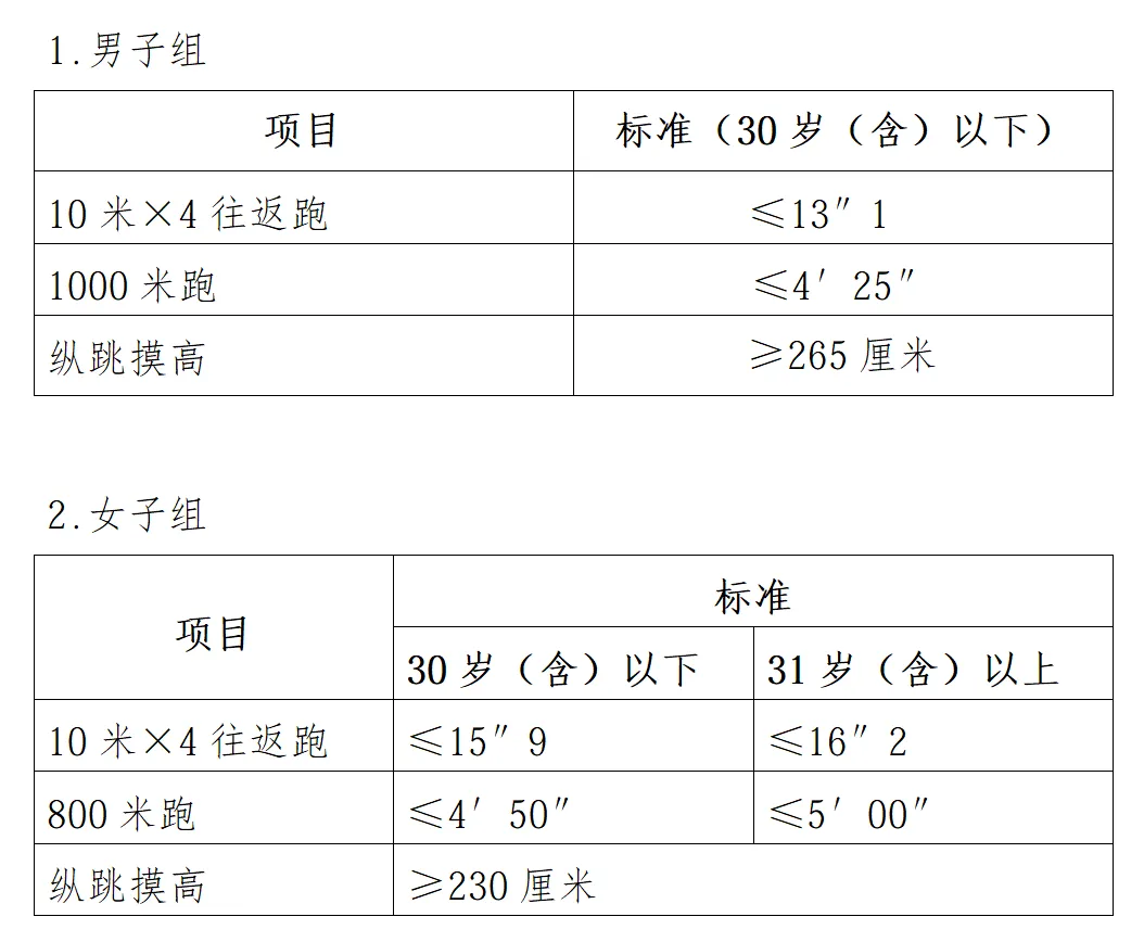 體能測(cè)試項(xiàng)目中,縱深摸高的測(cè)試次數(shù)不超過(guò)3次,往返跑的測(cè)試次數(shù)不超過(guò)2次,長(zhǎng)跑測(cè)試次數(shù)為1次。體能測(cè)試三項(xiàng)全部達(dá)標(biāo)方為合格,結(jié)果當(dāng)天確認(rèn)。