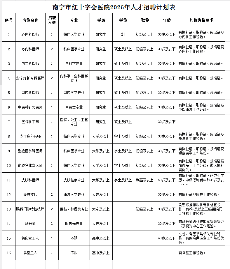 南寧市紅十字會醫(yī)院2026年人才招聘計劃表