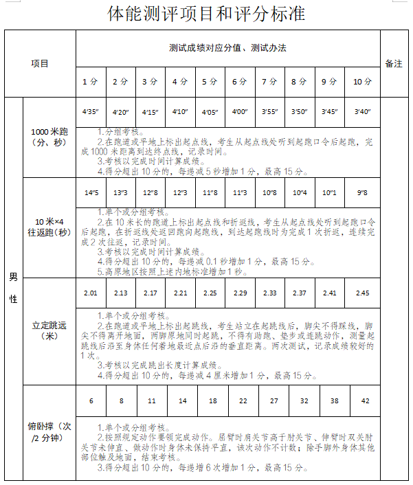任一單項(xiàng)得分為0的視為“不合格”,予以淘汰。體能測試所有項(xiàng)目均只測試一次,(標(biāo)準(zhǔn)見附件2、附件3)。