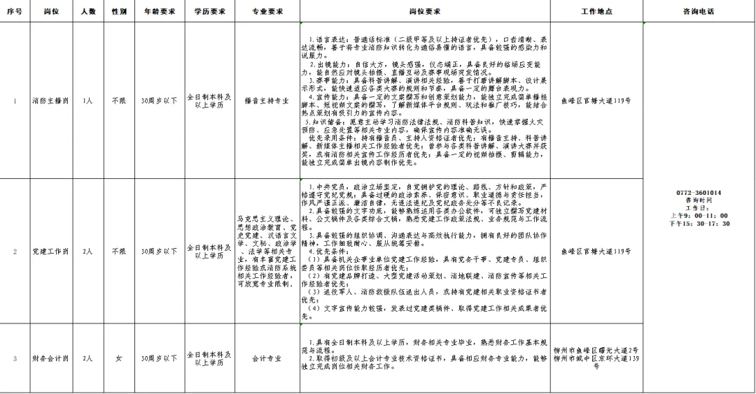 1.各崗位具體要求詳見本公告第一部分“招錄崗位”中的詳細(xì)描述。其中,滅火救援、駕駛、通信等一線執(zhí)勤崗位要求為男性,身高165CM以上,雙眼裸視力4.8以上、28周歲以下(有部隊(duì)服役經(jīng)歷或者全日制大專及以上學(xué)歷可放寬至30周歲)。